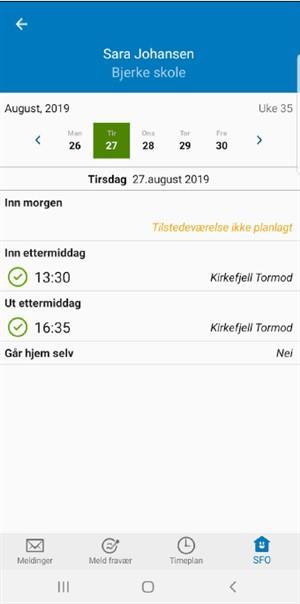Foresatte som har barn på SFO, har fått et ikon for dette nederst til høyre i appen. Ved å klikke på dette, kommer en inn på opplysningene som gjelder SFO for barnet: